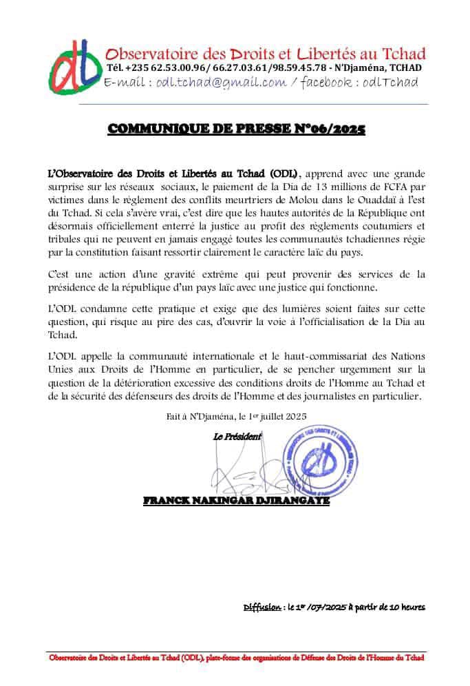 Dans un communiqué de presse publié ce 1er juillet 2025, l’Observatoire des Droits et Libertés au Tchad (ODL) exprime sa profonde consternation face à une information circulant sur les réseaux sociaux, selon laquelle une indemnisation de 13 millions de FCFA par victime aurait été versée dans le cadre du règlement des conflits meurtriers de […]