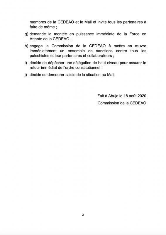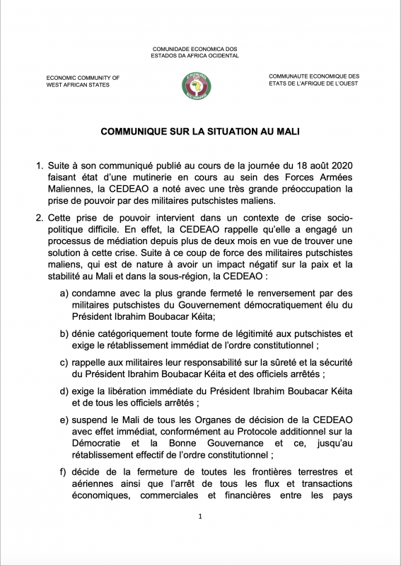 19 août 2020 #TCHAD #Afrique #Mali : Le syndicat des chefs d’états de la CEDEAO sanctionne les putschistes militaires maliens. (Communiqué officiel)