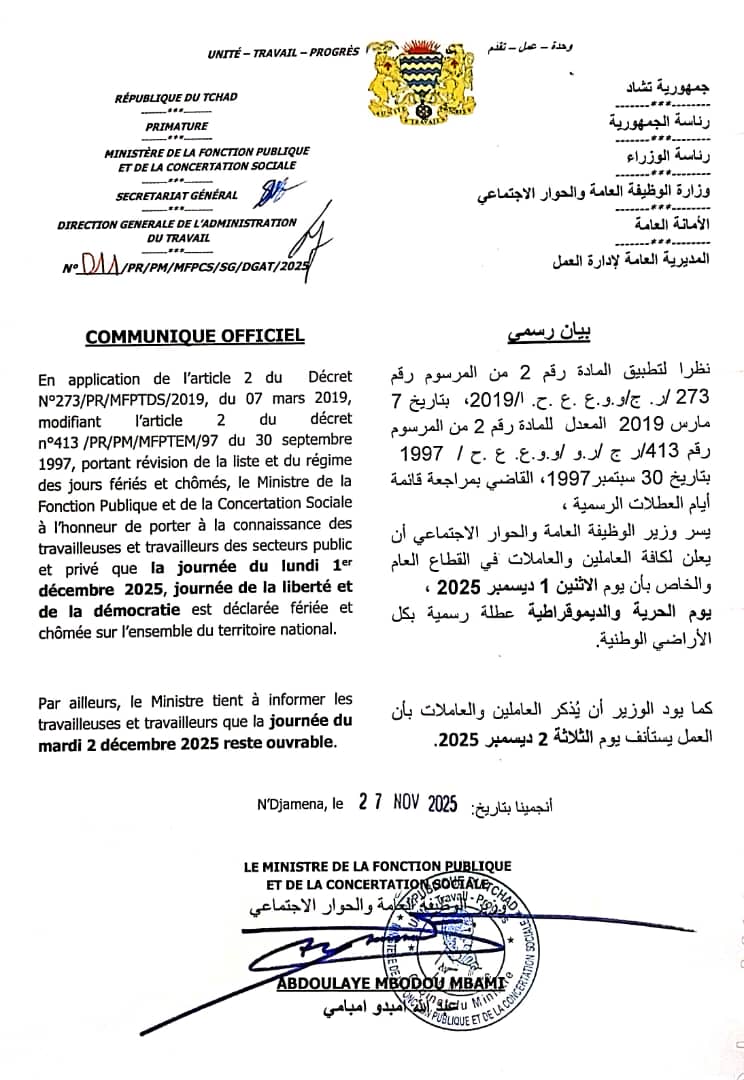 27 novembre 2025 #Tchad #Ferié: Le 1er décembre déclaré jour férié sur toute l’étendue du territoire national