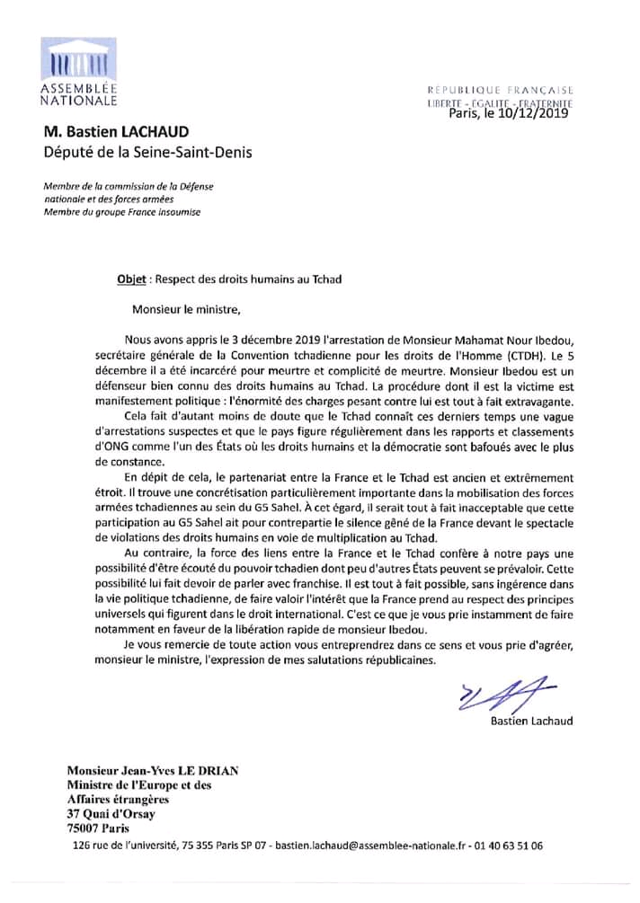 11 décembre 2019 #TCHAD #France : Le Député français Bastien Lachaud demande la libération de Mahamat Nour Ibedou.
