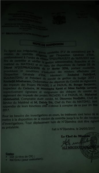 Le ministre de l’Aménagement du territoire et de l’urbanisme Hamid Mahamat Dahalob dans l’imbroglio d’un problème de malversations financières et autres dans son ministère. D’après nos sources au sein du ministère, c’est à la suite d’une fiche adressée à Idriss Déby que l’IGE (inspection générale de l’Etat) aurait été instruite pour aller fouiner et faire son investigation. Dans leur rapport, il est clairement reproché Mr Dahalob de reformer des véhicules pour lui et ses proches, de se faire payer des frais de mission dans les projets du ministère et la distribution des terrains au profit des siens. Même les journaux de la place s’en sont donné à cœurs joie de narrer le rapport de l’IGE. Selon es mêmes sources, plusieurs cadres du ministère seraient suspendus. Chaque jour qui fasse, et depuis le discours d’Idriss Déby indexant les voleurs de la république, les fonctionnaires et cadres issus du MPS et partis alliés, usent de subterfuge pour gruger l’État. Certains se donnent le plaisir de récidiver faisant presque un défi à leur chef. Déby parle, eux ils volent. À croire qu’il n’y a nul point une autorité de l’État. Tel est le constat… À suivre.