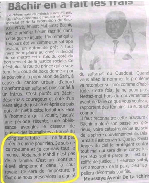Tous les Tchadiens, ne serait-ce que ceux qui avaient suivi les évènements du sultanat du dar Ouaddaï, avaient apprécié les premières prises de position de l’ancien ministre Ahamat Bachir affirmant la stricte vérité sur le sultanat du dar Ouaddaï. Mais entretemps l’eau semble couler sous le pont.